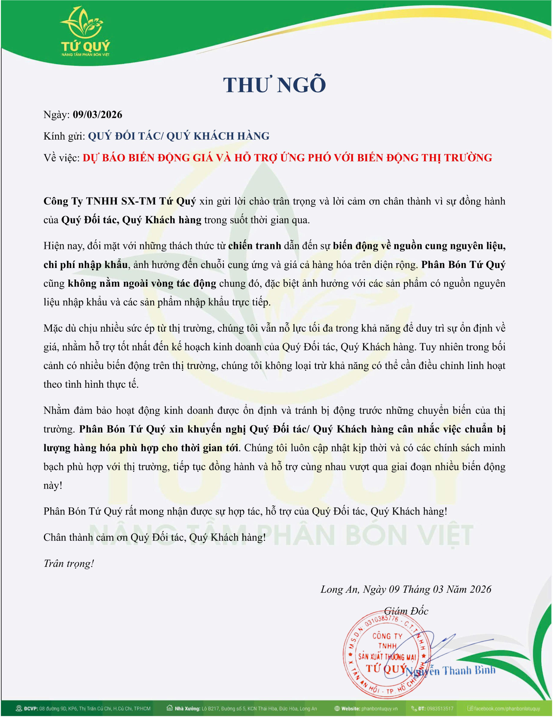 Trước bối cảnh đó, Phân Bón Tứ Quý khuyến nghị các đại lý và khách hàng chủ động chuẩn bị nguồn hàng phù hợp để đảm bảo hoạt động kinh doanh ổn định và hạn chế rủi ro trước những thay đổi của thị trường.